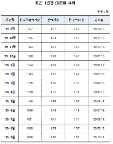 은행권 변동형 주택담보대출의 기준금리가 되는 코픽스(COFIX·자금조달비용지수)가 일부 상승했다. 올해 9개월... 변동형 주담대의 기준금리가 되는 코픽스가 일부 상승하면서 은행권 주담대 금리도 올라갈 전망이다....