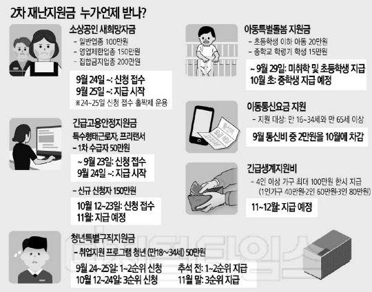 2차 재난지원금 6조3000억 특별피해업종은 증빙 없이 지원 법인택시도 8만여명에 100만원 9월 통신비, 10월에 차감 지급 정부는 23일 국무회의와 긴급 재정관리점검 회의를 열어 소상공인 새희망자금, 특고와 프리랜서...